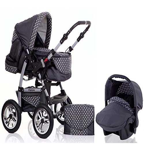 bieten 15 teiliges Qualitäts-Kinderwagenset 3 in 1 "FLASH": Kinderwagen + Buggy + Autokindersitz - all inklusive Paket in Farbe GRAU-POLKA